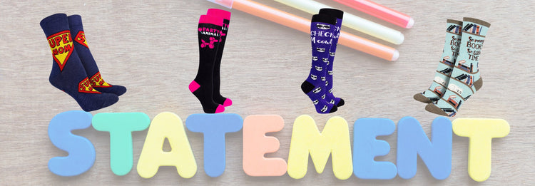 Det gode er at alle sammen kan skjules af buksebenet lige indtil man vælger ikke at skjule dem mere - så er det bare at trække op og vise budskabet. Så alle vores strømper med tekst kan sagtens bruges til det daglige outfit - for der er masser af farver og sjove motiver.