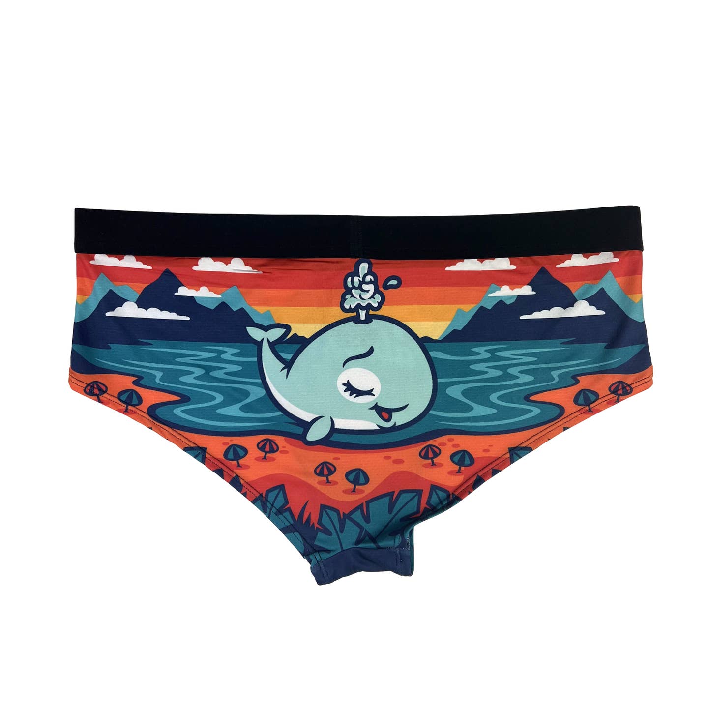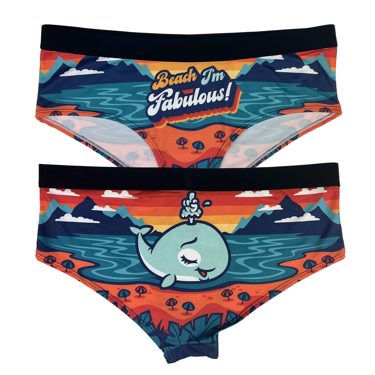 Disse sjove trusser med 'Beach I'm Fabulous!' design er den perfekte gave til kvinder, der elsker stranden, havet og sommerstemning! Med et fantastisk design af en charmerende lyseblå hval med fontæne, 'Beach I'm Fabulous!' tekst i orange og hvid retro-skrift, omgivet af mørkeblå bjerge, turkisblåt hav, orange strand med blå parasoller og grønne palmer på orange-gul solnedgangsbaggrund, kombinerer disse trusser strand-æstetik med komfort. Designet i Chicago og fremstillet med høj polyester-andel for maksimal komfort og holdbarhed.
