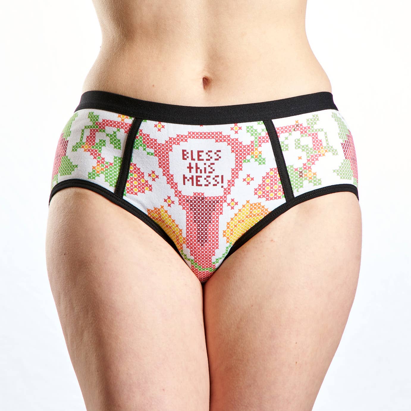 Disse sjove menstruationstrusser med 'Bless This Mess' design er den perfekte gave til kvinder, der elsker humor, periode-positivitet og charmerende broderi-æstetik! Med et fantastisk design af en sød livmoder-karakter med korssting-broderi-stil, 'Bless This Mess' tekst i rød skrift, omgivet af farverige blomster - røde, gule og grønne - på hvid baggrund med sort kant, kombinerer disse trusser periode-humor med komfort. Designet i Chicago af Harebrained og fremstillet med høj polyester-andel for maksimal komfort og holdbarhed.