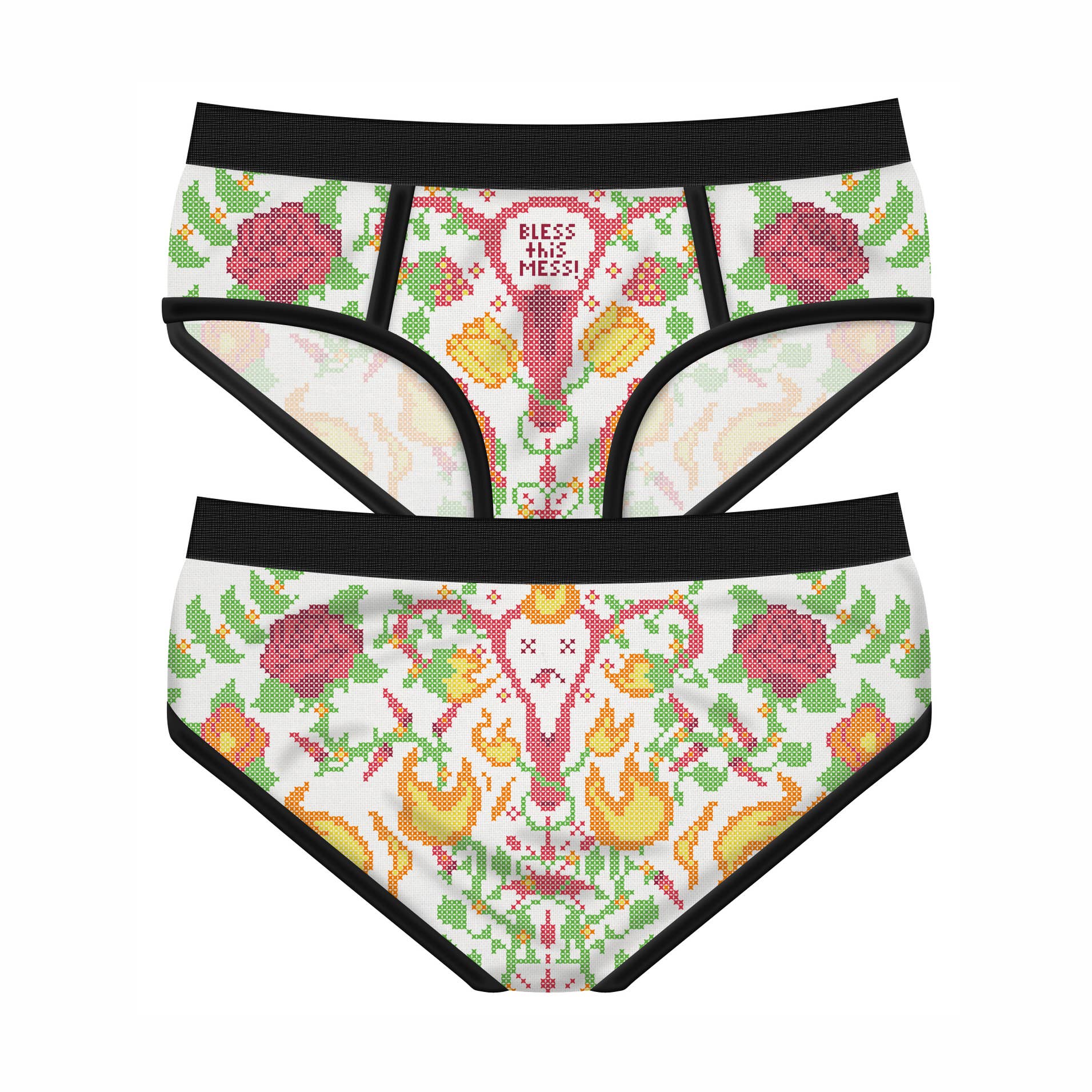 Disse Bless This Mess menstruationstrusser har et imponerende broderi-inspireret design på hvid baggrund med sort kant. Forsiden viser en charmerende pink livmoder-karakter med lukkede øjne (X X), smil og lille blomst tegnet i korssting-broderi-stil. 'BLESS THIS MESS!' tekst i rød korssting-broderi står centralt. Hele designet er omgivet af farverige blomster - røde, gule og grønne - samt grønne blade, alle tegnet i klassisk korssting-broderi-stil.