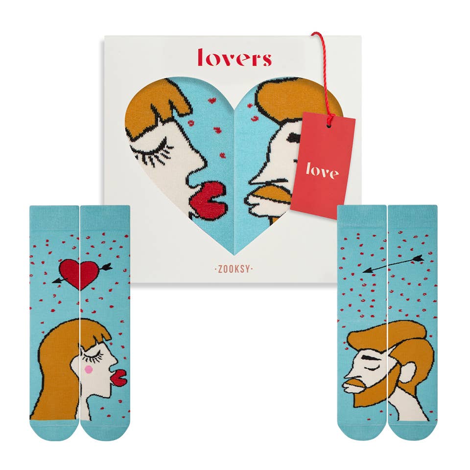 Dette elskers sokkesæt har et imponerende romantisk design på turkisblå baggrund med pink hjerter. Den ene sok viser en kvinde med mørk blond hår, lukkede øjne med lange vipper, pink kinder og røde læber der sender et kys. Den anden sok viser en mand med mørk blond hår og skæg, lukkede øjne og læber klar til et kys. Når de to sokker holdes sammen, mødes deres læber i et romantisk kys, og et rødt hjerte med sort pil vises mellem dem.